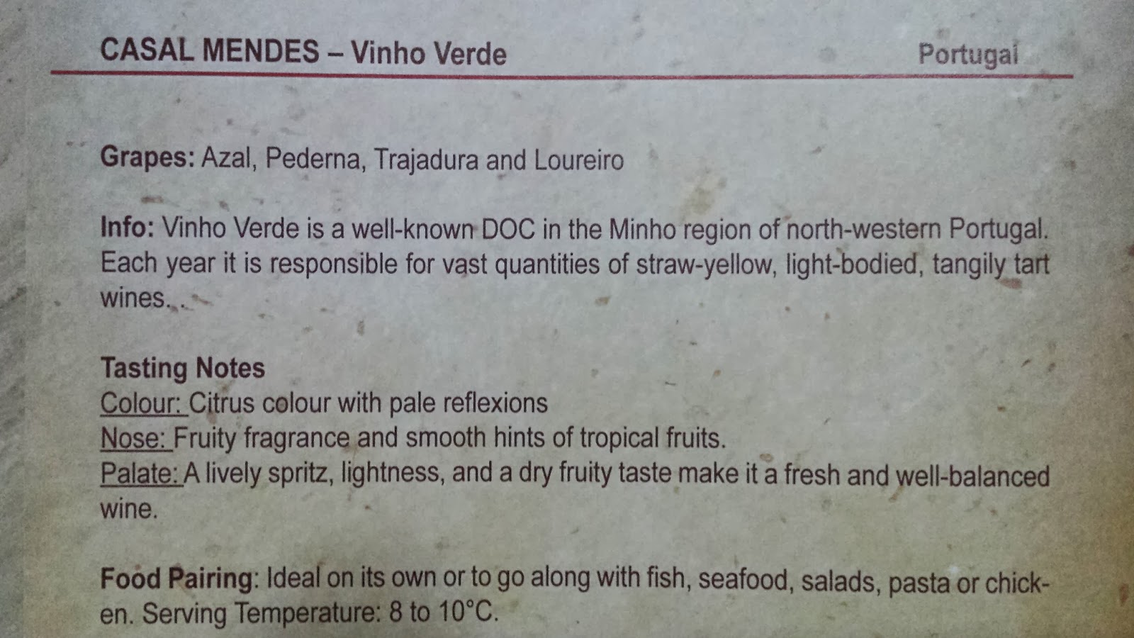 The second wine served was the Casal Mendes - Vinho Verde, Portugal made from grapes : Azal, Pederna, Trajadura, Loureiro.